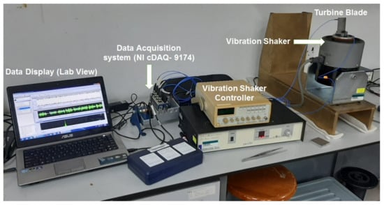 In modal analysis, the free vibration response of the system is measured. However, for vibration fatigue life estimation, the blades must be subjected to continuous excitation using a vibration shaker. The experimental setup for forced vibration analysis is illustrated in Figure 4.