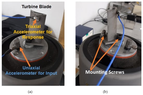 Blade mounting on the vibration shaker: (a) accelerometer mounting; (b) illustration of mounting screws.