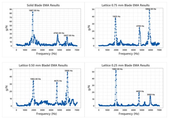 Experimental and numerical modal analysis was performed to obtain the resonant natural frequencies and mode shapes for turbine blades. Figure 7 shows the experimental modal analysis results for each turbine blade. Each distinct peak corresponds to a natural frequency. For a selected frequency range of 7000 Hz, each turbine blade has three natural frequencies, with lattice blades having higher natural frequencies compared to the solid blade. Results indicate that of all blades, the solid blade has exhibited the lowest natural frequency (1887.50 Hz), while the 0.25 mm lattice blade exhibited the highest natural frequency (1987.50 Hz) at this mode, which is 5.29% higher compared to that of the solid blade. This indicates that decreasing the diameter of the octet-truss struts results in extension of the first natural frequency. This is a significant advantage of using octet-truss lattice structures as along with weight reduction, enhancement of natural frequency is also achieved, which can increase the operating range of turbine for rigid mode rotor operation. A similar trend is observed at the third mode as well. However, at the second mode, this trend is inversed, i.e., the solid blade has a maximum natural frequency (4762.5 Hz), while the 0.25 mm lattice blade has the lowest (4650 Hz) of all blades.