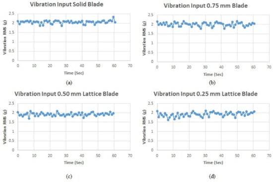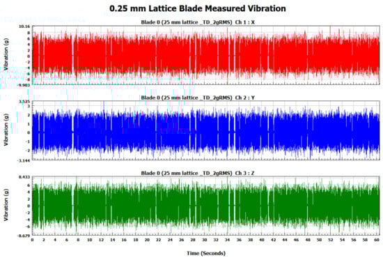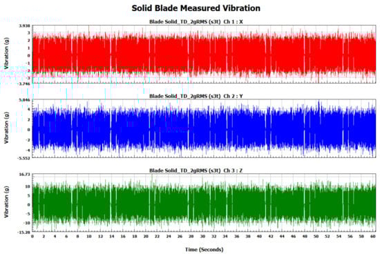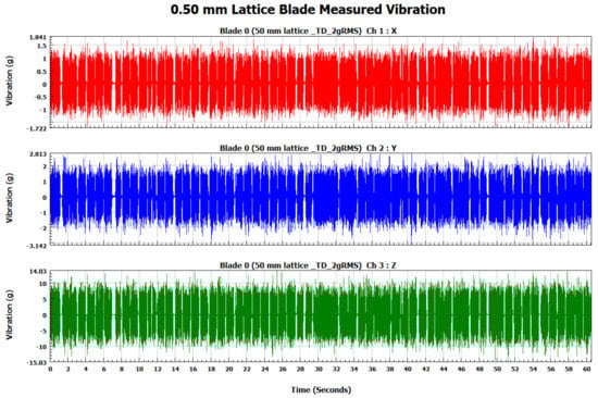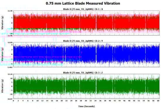 The forced vibration analysis was performed to investigate the response of the turbine blades when subjected to vibration loads of random nature similar to the ones experienced during their operational life. The response of each blade was measured in terms of vibration acceleration in the X, Y, and Z directions for each blade. In order to ensure similar loading conditions for each blade, the applied vibration signal was controlled by its RMS value using a vibration shaker. As shown in Figure 9, the RMS of the input signal for each blade is 2 g (19.62 m/s2). The measured response signals in terms of vibration acceleration for the solid, 0.75, 0.50, and 0.25 mm lattice blades in the time domain are shown in Figure 10, Figure 11, Figure 12 and Figure 13, respectively.