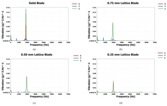 Response PSD results of turbine blades: (a) the solid blade; (b) the 0.75 mm lattice blade; (c) the 0.50 mm lattice blade; (d) the 0.25 mm lattice blade.