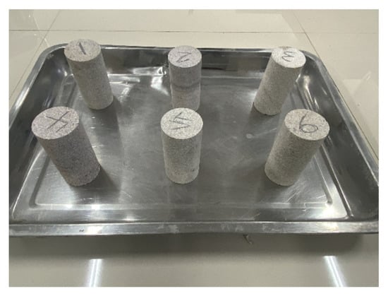 For high-temperature heating of the sandstone specimens, the specimens were spaced evenly in the furnace chamber and the furnace door was closed, and then they were heated slowly at a heating rate of 10 °C/min. After heating to the preheating temperature, the sandstone was kept at a constant preheating temperature for 2 h to ensure more uniform heating inside and outside the sandstone specimens, and then the furnace door was slowly opened to allow the specimens to cool naturally to room temperature. Finally, the high-temperature-treated sandstone specimens were sealed and stored in sample bags, and relevant tests were carried out after all preparations were completed.