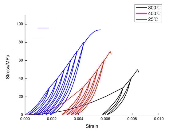 In order to analyze the evolution law of axial stress and axial strain in the sandstone under the effect of graded unloading after application of high temperatures, Figure 3 shows the stress–strain curves of sandstone under the effect of graded loading and unloading after experiencing different high temperatures.