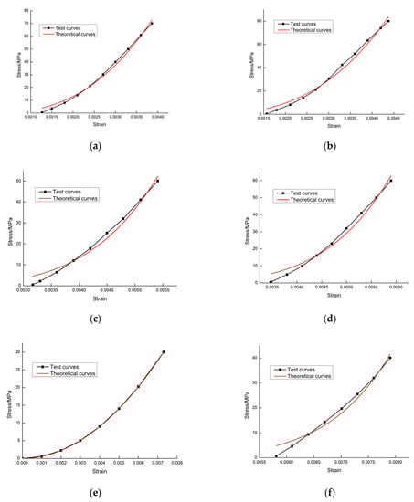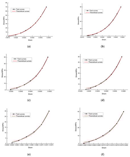 Comparison of theoretical and experimental curves during the loading phase: (a) 25 °C, 70 MPa level loading; (b) 25 °C, 80 MPa level loading; (c) 400 °C, 50 MPa level loading; (d) 400 °C, 60 MPa level loading; (e) 800 °C, 30 MPa level loading; (f) 800 °C, 40 MPa level loading.