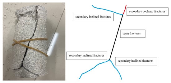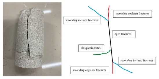 The fracture extension of the sandstone specimen after 800 °C high-temperature heating treatment was composed of three fracture forms: open fracture, secondary coplanar fracture, and secondary inclined fracture. Firstly, an open fissure was formed in the middle of the sandstone specimen, then secondary coplanar fissures sprouted in the upper tip of the open fissure. With the increase in load, secondary coplanar fissures kept expanding along the direction of the open fissure in the upper tip of the open fissure; while the secondary coplanar fissures expanded, secondary tilted fissures appeared in the upper tip of the open fissure, which expanded along the direction of a certain angle with the open fissure. Finally, the sandstone specimen was damaged, and the upper and lower ends of the open fissure showed “Y” and inverted “Y” fissure expansion patterns, respectively. As shown in Figure 9.