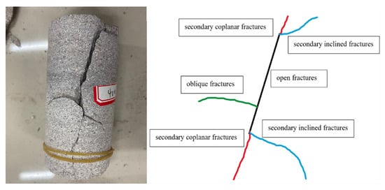 In this test, two groups of sandstone that experienced high-temperature heating at 400 °C and 800 °C, respectively, and sandstone at room temperature were subjected to cyclic addition and unloading tests. Through statistical analysis of sandstone damage patterns after the tests, it was found that there were four types of fractures that led to the overall rupture of the sandstone: (1) open fractures (Black Line); (2) secondary coplanar fractures (Red Line); (3) secondary inclined fractures (Blue Line); and (4) oblique fractures (Green Line).