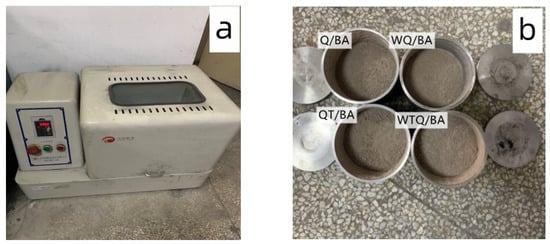 The MSWI ball mill adopts the xQM-4 planetary ball mill produced by Changsha Tianchuang Powder. The ball mill is shown in Figure 2a. The specific four processing steps are as follows: direct ball milling method (Q/BA), using a planetary ball mill for the direct ball milling test of MSWI raw materials, with a grinding speed and time of 20 r/min and 40 min; ball milling heat treatment (QT/BA), on the basis of the micropowder obtained by direct ball milling, with heat treatment at 750 °C for 5 h; the water washing ball milling method (WQ/BA), in which we soak the MSWI raw materials in water to remove impurities, and then grind according to the above steps; the ball milling method (WTQ/BA), in which the bottom slag after washing and removing impurities is first heat-treated, and then ground according to the same process as in method 1. The processed MSWI bottom slag-regenerated micropowder is shown in Figure 2b.