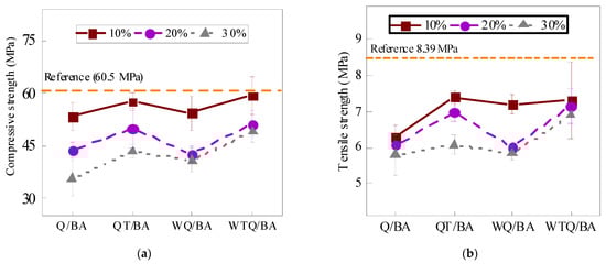 Different contents of Q/BA, QT/BA, WQ/BA, and WTQ/BA in compressive strength (a) and flexural strength (b).