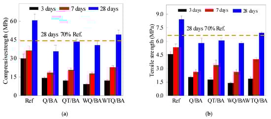 Compressive strength (a) and flexural strength (b) of MSWI mortars within 3, 7, 28 days of curing of Ref, Q/BA, QT/BA, WQ/BA, and WTQ/BA.