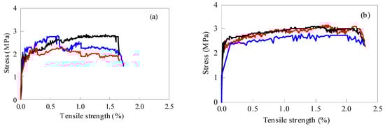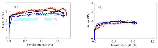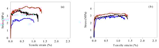 Uniaxial tensile stress–strain curves of ECC specimens with different fiber content, (a) and (b) refer to the 1.5% and 2.55 fiber dosage, respectively.