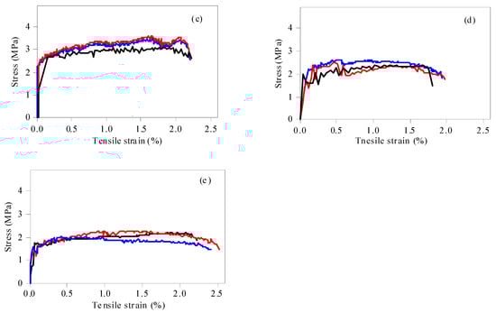 Uniaxial tensile stress–strain curves of ECC specimens with different WTQ/BA content, (a–e) refer to the 1.2, 1.5, 2.2, 3.0, and 4.0 dosages of MWSI, respectively.