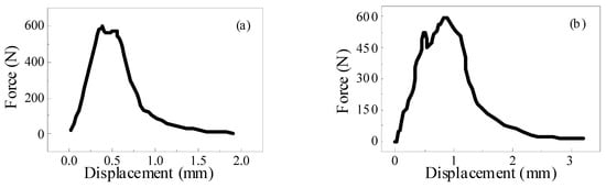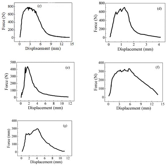 Load–displacement curves of matrix specimens with different MSWI dosage and water-binder ratios, (a–e), refer to the 1.2, 1.5, 2.2, and 3.0 MSWI dosage; (f,g) refer to 0.2 and 3.0 water-binder ratio.