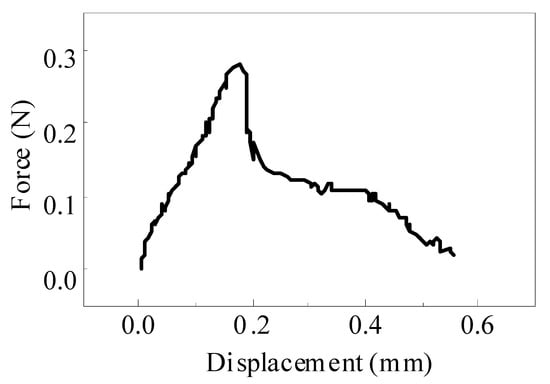 The single fiber pull-out test of ECC with MSWI included two processes: specimen making and single fiber pulling out. In the production stage of test specimens, a mold with reserved holes was used. After the fiber passed through the mold, ECC materials were poured into PVA fibers buried below 1.0 mm. After curing to the specified age, ECC materials were cut to obtain specimens that met the test requirements. The single fiber pull-out test of ECC materials was carried out on a small-range pull-out test machine, including the fixation of specimens, the bonding of fibers, and the adjustment of the base to place the fibers in a vertical state, and then the fiber pull-out test was carried out under a certain control displacement. The size of the single fiber pull-out specimen was approximately 10 mm × 5 mm × 1 mm. The single fiber pull-out test was divided into 7 groups, as with the three-point bending test, and the mixing amount of micropowder and water–binder ratio were taken as the changing parameters, which were consistent with the mixing amount of D1–D7 in Table 6.