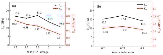 Fracture toughness and elastic modulus of ECC with different WTQ/BA dosages (a) and water–binder ratios (b).