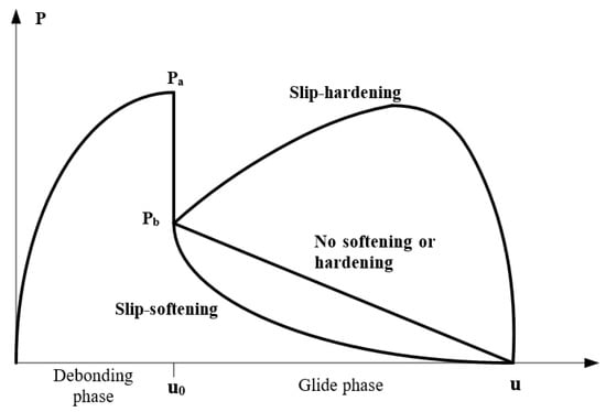 The material properties of ECC were mainly determined by the matrix, fiber, and the interface characteristics between fiber and matrix. Fiber/matrix parameters generally include chemical bond Gd, interfacial friction τ0, and fiber slip-hardening factor β. In this paper, chemical bond Gd and interfacial friction τ0 were studied. The relationship between single fiber pulling force and displacement under different slip-hardening conditions of ECC materials is shown in Figure 16. When the debonding stage between the fiber and the matrix is complete, the tension on the fiber suddenly drops from Pa to Pb. This may be due to the sudden disappearance of Gd, the chemical bond between the PVA fiber and matrix, resulting in the unstable propagation of cracks and the sudden drop in external tension. Therefore, Gd can be calculated from tension Pa and tension Pb, as shown in Formula (5). In addition, the frictional bond strength τ0 between the PVA fiber and substrate can be calculated according to Formula (6).
