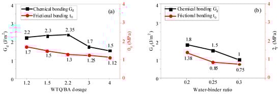 Chemical bonding Gd and frictional bonding τ0 of ECC with different WTQ/BA dosages (a) and water–binder ratios (b).