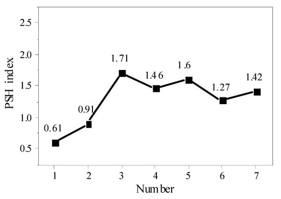 The change in the ECC strain-hardening index PSH is shown in Figure 18. In the past, when the powder content was 1.2% (group 1) and 1.5% (group 2), the PSH index was less than 1, which does not meet the strain-hardening energy criterion. It can be seen that the residual energy of group 1 and 2 external forces cannot cause the crack to continue to expand stably. With the increase in external forces, the width of the crack also increases rapidly, ultimately leading to the destruction of ECC materials. Although the strain-hardening strength criterion, namely σ0/σcr >1, was satisfied, the stable strain-hardening property of ECC could not be guaranteed. When the content of fine powder exceeded 2.2% (group 3, group 4, group 5), the PSH index was greater than 1, which meets the basic condition of strain hardening. When the powder content was 2.2%, all the PSH indexes were greater than 1, and both the energy criterion and strength criterion were satisfied, even in the case of different w/c ratios (groups 3, 6, and 7). When the micropowder content was 2.2%, the water–binder ratio was 0.25, and the fiber volume content was 2.0%; the PSH index (Jb’/Jtip) was 1.71, and the increase in the PSH index was conducive to the strain-hardening behavior of ECC and more saturated and stable multi-crack cracking.