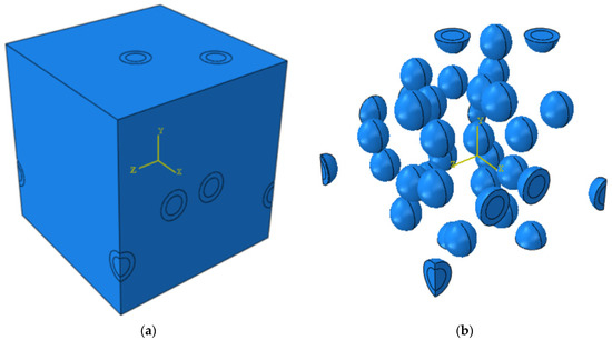 A displacement boundary condition was applied to the nodes on the surfaces of the RVE. Uniaxial tension was applied in the x direction. The lengths of the RVE model are denoted as , , and , and the displacement boundary condition can be expressed as: