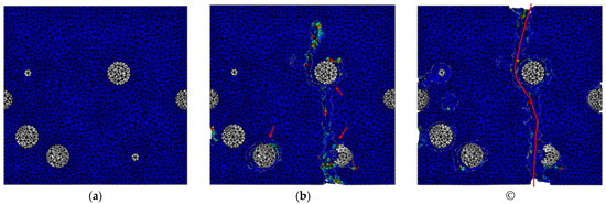 Upon applying uniaxial tension to the RVE, the simulated composite strength was at about the same level as that of the matrix strength, and no strengthening effect was observed. The damage pattern is shown in Figure 2. The colored contour in Figure 2 represents the scalar degradation status (SDEG), which is an indicator of the damage variable based on the maximal stress that a damaged element can sustain. When the SDEG value of any element reaches unity for cohesive elements, and 0.99 for other type of elements, this element is fully damaged and is deleted, as it cannot sustain any loading. A cross-sectional damage process is shown in Figure 2 with the loading applied in the horizontal direction with respect to the plane. Figure 2a is the undamaged state. Figure 2b shows that the damage (cracks) started to appear at a few separate locations at the matrix regions around the nanoparticles. As the damaging process progressed, nearby cracks eventually joined up to form a through crack and caused catastrophic failure to the nanocomposite, as shown in Figure 2c.