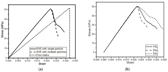 Stress−strain curves of (a) matrix and RVEs with single and multiple nanoparticles; (b) RVEs with a single nanoparticle of different weight percentages.