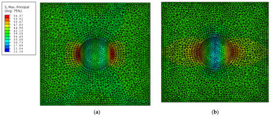 As the maximal stress in the matrix is the main concern here, the failure of the core and shell was not considered. Therefore, the core–shell structured nanoparticle is represented as a homogenized single-phase particle of the same size with twice the stiffness of the matrix, and perfect bonding was assumed between particle and matrix. A validation test was performed on a three-dimensional (3D) RVE to check that this simplification did not affect the stress distribution in the matrix, especially the maximal stress. Figure 9a shows cross-sectional stress distribution in the matrix of the RVE with a core–shell nanoparticle; in Figure 9b, this core–shell inclusion was replaced by a homogenized single-phase nanoparticle with twice the stiffness of the matrix. The nanoparticles were removed from both figures for a clearer view of stress distributions in the matrix. The stress magnitudes and distributions did not differ significantly between the two RVEs. In addition, the stiffness improvement resulted from the homogenization matching with the experimental work in [15].