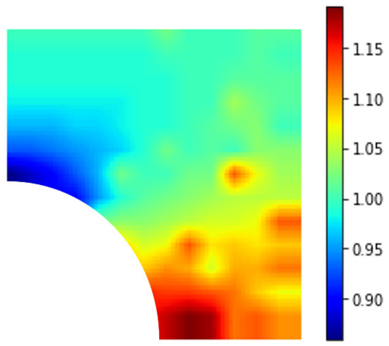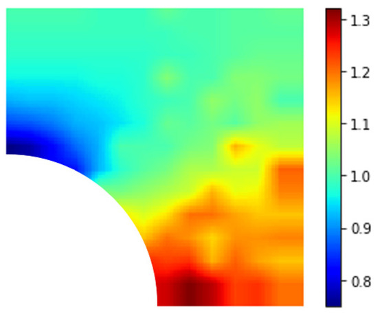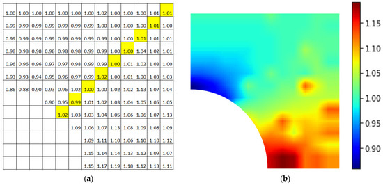 Figure 11a is the top-right quarter of a 2D plate with a homogenized nanoparticle at the center. The empty bottom-left squares represent a quarter of the particle. The numbers denote the relative stress of the bottom crack tip in RVE normalized by that of pure matrix model (50 MPa). The location of each relative stress value in Figure 11a is also the location of the bottom tip of the crack. Figure 11b is the contour plot of Figure 11a.