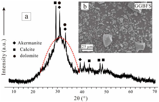 GGBFS was purchased from Yuanheng Environmental Protection Engineering Co., Ltd., in Henan province, Nanyang, China. Its chemical composition (determined via X-ray fluorescence) by mass of oxides was as follows: SiO2 (33.21 wt%), CaO (37.14 wt%), Al2O3 (15.76 wt%), Fe2O3 (0.71 wt%), MgO (8.51 wt%), TiO2 (1.91 wt%), and others (2.76 wt%). CaO and SiO2 accounted for 70.35 wt% of the total GGBFS composition. The XRD patterns (Figure 1a) featured one broad peak spanning from 19°(2θ) to 40°(2θ), indicating that GGBFS was mainly in the amorphous phase, with small amounts of crystals, such as calcite, akermanite, and dolomite. SEM images (Figure 1b) showed that the particles in the GGBFS were nonuniform in size and angular.