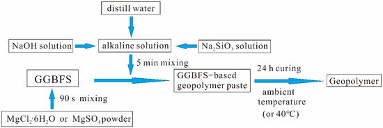 Chemical-grade NaOH pellets (Zhiyuan Chemical Reagent Co., Ltd., Tianjin, China; purity ≥ 96%) and Na2SiO4 pellets (Henyuan New Material Co., Ltd., Zhengzhou, China; Na2O 26.0 wt% and SiO2 60.0 wt%, modulus of 2.9) were used as alkali activators. MgCl2·6H2O (Yongda Chemical Reagent Co., Ltd., Tianjin, China; purity ≥ 98%) and MgSO4 (Baishi Chemical Co., Ltd., Tianjin, China; purity ≥ 99%) were used as additives. All of the chemical agents were obtained from commercial suppliers.