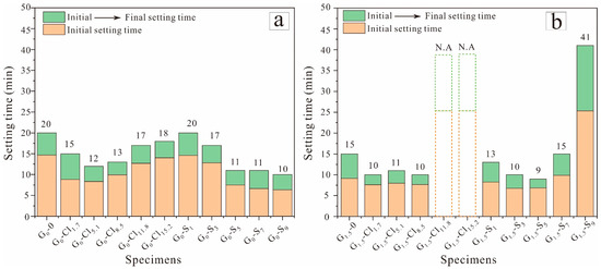 Figure 3b shows that the final setting time of the Na2SiO3-activated GGBFS with 5.0 wt% MgSO4 (9 min) was shorter than that of the salt-free, Na2SiO3-activated GGBFS (G1.5-0, 20 min), but the geopolymer with 9 wt% MgSO4 exhibited a significantly longer setting time (41 min). In particular, at a MgCl2·6H2O dosage of >8.5 wt%, the geopolymer paste could not set at the ambient temperature. At high magnesium salt concentrations, the occurrence of Cl and SO42 prolonged the setting time of Na2SiO3-activated GGBFS relative to that of NaOH-activated GGBFS (Figure 3a).