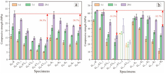 Figure 4a shows that magnesium salt addition negatively affected the compressive strengths of NaOH-activated GGBFS. With an increase in the MgCl2·6H2O concentration from 0 to 8.5 wt%, the 28 d compressive strength of the geopolymer decreased from 31.4 to 14.7 MPa; however, with a further increase to 15.2 wt%, the compressive strength barely changed. The G0-S samples exhibited similar results: the 28 d compressive strengths of the geopolymer decreased from 31.4 to 23.8 MPa with an increase in the magnesium salt concentration from 0 to 5 wt% and then remained almost unchanged with a further increase. These results suggest that at a high magnesium salt concentration, the anions offset the negative effect of Mg2+, thereby improving the compressive strength of the NaOH-activated, GGBFS-based geopolymer.