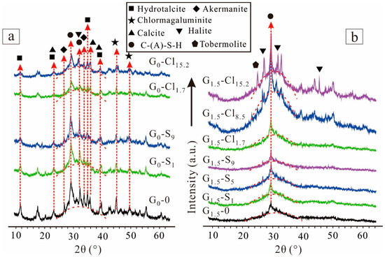 Figure 5 shows the XRD patterns of selected GGBFS-based geopolymers. G0-0 showed a different diffraction pattern from G1.5-0. The XRD pattern of G0-0 featured a broad peak ranging from 24°(2θ) to 42°(2θ). The peak was centered at 32°(2θ) in the XRD patterns of the geopolymer but at 30°(2θ) in those of GGBFS (Figure 1), indicating the formation of an amorphous geopolymer (C-(A)-S-H), which may contribute to strength development. In addition to the amorphous phase, many neoformed crystals occurred in the geopolymers. Peaks corresponding to crystal C-(A)-S-H and hydrotalcite-like (Mg6Al2(CO3)(OH)16·4H2O), a Mg-layered double hydroxide phase, were identified at approximately 29°(2θ) (with a d022 of 3.1 Å) and 11°(2θ) (with a d006 of 7.6 Å), respectively [54,55]. Chlormagaluminite ((Mg, Fe)4Al2(Cl, CO3)(OH)12·2H2O), with a comparable composition and structure with hydrotalcite-like phases, was also formed. Moreover, numerous unreacted species, such as calcite and akermanite, also occurred, as they did not react with NaOH. The magnesium-salt-containing geopolymers exhibited no considerable diffraction difference; they only differed in the intensity of XRD peaks corresponding to hydrotalcite-like phases, which was attributable to the replacement of CO32 by Cl or SO42, because the CO32 in the interlayers of the hydrotalcite-like phases was displaceable [38].