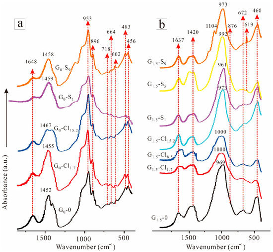 Figure 6 shows the FTIR spectra of selected geopolymers in the 400–1800 cm−1 range. The FTIR spectra of G0-0 (Figure 6a) featured an absorption band at approximately 1648 cm−1, corresponding to the bending vibration of H–O–H, resulting from water absorption [57]. The broad band at approximately 1452 cm−1 corresponded to the asymmetric stretching vibration of O–C–O from hydrotalcite-like phases, Na2CO3, and unreacted CaCO3 [55,58]. In addition, another band corresponding to the stretching vibration of carbonate from calcite occurred at 896 cm−1 [55]. However, this band has been reported to correspond to the stretching vibration of Si-O from C-(A)-S-H [58]. Moreover, bands between 1200 and 900 cm−1 corresponded to the asymmetric stretching vibration of Si-O-T (T: Si or Al); these bands, denoted as “main bands,” have been widely reported in research on the chemical properties of alkali-based geopolymers [59]. The small peak at 718 cm−1 corresponded to Si-O-AlIV bending vibration, while those at 664 and 602 cm−1 corresponded to deformation vibrations of Si-O-T from C-(A)-S-H [54]. Furthermore, the absorption bands at 483 and 456 cm−1 corresponded to the bending vibration of Si-O-Si. After the addition of magnesium salts, the bands at 1452 cm−1 shifted to a slightly higher field, which is attributable to the displacement of CO32 and anions (i.e., Cl and SO42). The FTIR spectra featured no other change, indicating that the ions did not significantly alter the geopolymer molecular structure.