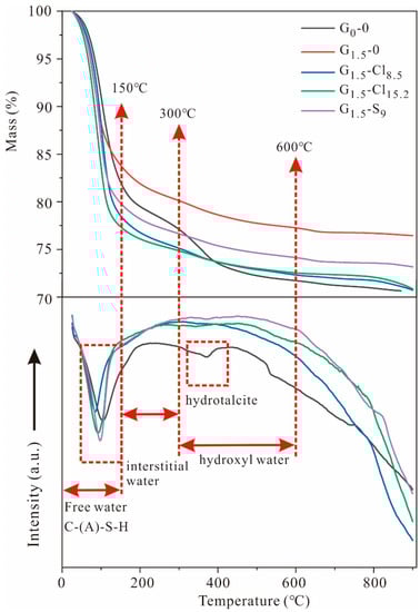The thermal properties of G0-0, G1.5-0, G1.5-Cl8.5, G1.5-Cl15.2, and G1.5-S9 are shown in Figure 7. G0-0 exhibited a total mass loss of ~30%, which was much greater than that of G1.5-0 (~20%). The magnesium-salt-containing geopolymers exhibited a higher total mass loss, demonstrating that the salt restricted water evaporation from the geopolymeric paste. The Cl-containing geopolymers appeared to retain more water than the SO42-containing geopolymers because G1.5-Cl8.5 and G1.5-Cl15.2 exhibited a higher mass loss than G1.5-S9 after calcination to 900 °C.