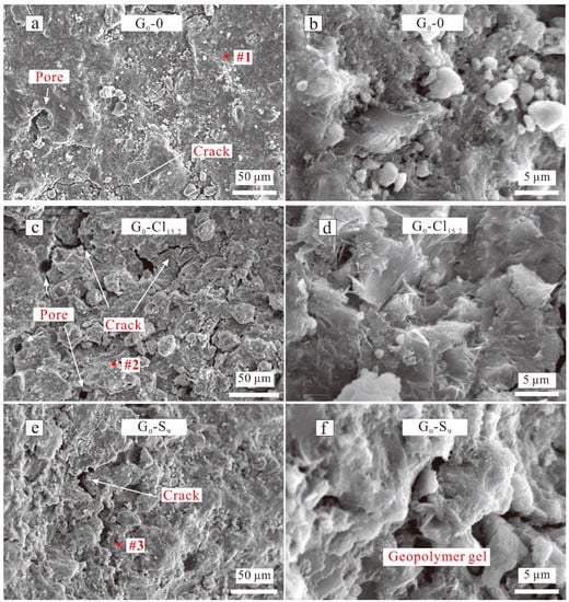 Figure 8. SEM images of NaOH-activated geopolymers of (a) G0-0, (c) G0-Cl15.2, (e) G0-S9 at low magnification; SEM images of NaOH-activated geopolymers of (b) G0-0, (d) G0-Cl15.2, (f) G0-S9 at high magnification.