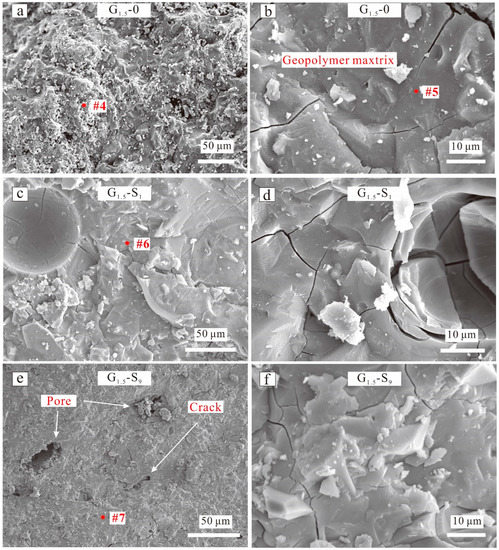 The morphologies of the MgSO4-containing geopolymers were not considerably different from that of the MgSO4-free geopolymer. G1.5-S1 exhibited a relatively compact and dense morphology (Figure 9c,e) but contained numerous microcracks (Figure 9d,f). In addition, the geopolymer matrix contained numerous macropores, which originated from the entrapped air. The S concentration of the MgSO4-containing geopolymers, detected via EDX spectroscopy, increased with increasing MgSO4 concentration (Figure 11, spots 6, 7), indicating that SO42 was evenly distributed in the geopolymer matrix. However, the Mg2+ concentration did not change in this manner.