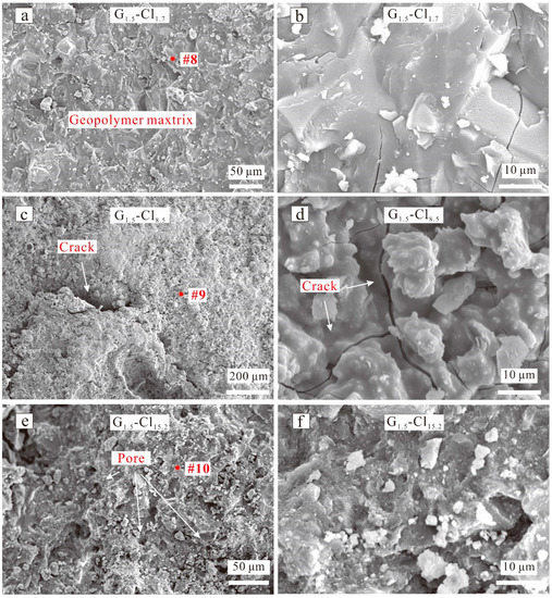 Figure 10 shows the SEM images of G1.5-Cl. G1.5-Cl1.7, which exhibited a dense microstructure (Figure 10a) and showed no morphological difference from G1.5-0. Only a little amount of Cl element was detected via EDX spectroscopy (Figure 11, spot 8). The geopolymer with a salt concentration of 8.5 wt% exhibited a loosely bound matrix, macrocracks, uneven surface, and an inhomogeneous microstructure (Figure 10c), and numerous particles were distributed on the surface of the geopolymer matrix (Figure 10d). G1.5-Cl15.2 exhibited a more compact matrix than G1.5-Cl8.5 (Figure 10e), indicating that increasing the curing temperature favored the densification of the geopolymer matrix. However, numerous pores and particles occurred on the matrix surface. All of these changes in the microstructure reduced compressive strength.