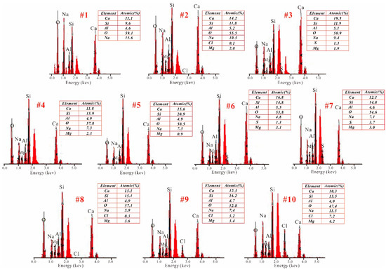 Figure 8, Figure 9 and Figure 10 show the SEM images of selected geopolymers, and Figure 11 displays the EDX spectra of the red spots in Figure 8, Figure 9 and Figure 10. G0-0 exhibited a compact microstructure but also had some cracks and macropores (Figure 8a). The gels were connected firmly, but many isolated particles still occurred, resulting in microstructure inhomogeneity. The EDX result (Figure 11, spot 1) indicated that the G0-0 matrix was mainly composed of O, Na, Ca, Si, and Al, indicating the formation of N,C-(A)-S-H gels and a strengthening effect. After the addition of magnesium salts, the geopolymer matrix became loosely bound, accompanied by the development of numerous cracks and pores (Figure 8c,e). However, the EDX results of G0-Cl15.2 (Figure 11, spot 2) indicated that the Cl ions were not evenly distributed in the matrix. These results indicate that Cl may react with Na to form halite or displace CO32 to form Cl-hydrotalcite, rather than spread in the matrix of the NaOH-activated, GGBFS-based geopolymer. G0-S9 exhibited a similar result (Figure 11, spot 3); its S concentration was substantially less than that of G1.5-S9 (Figure 11, spot 7). Although Mg2+ was also detected, GGBFS inherently contained some MgO; thus, it is difficult to determine the role of Mg2+. In addition, some plate- and needle-like crystals occurred in G0-Cl15.2 (Figure 8d); the plate-like crystals, owing to their hexagonal shape, could be Friedel’s salt from the Cl content. Figure 8f shows that numerous large voids occurred in G0-S9, which reduced the ultimate compressive strength.