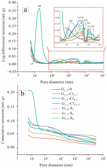 Figure 12. MIP results of geopolymers: (a) log differential intrusion and (b) cumulative intrusion.