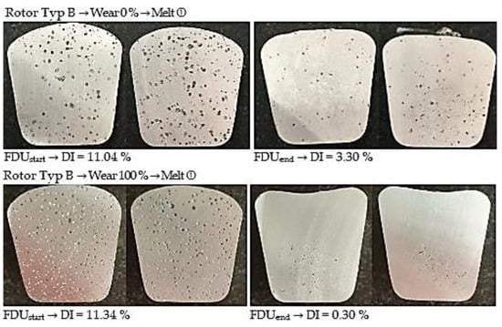 From the above values, it is clear that the melt contains an increased amount of hydrogen before refining. This is evidenced by the higher expected values of DI at FDUstart, which range from 11.44 to 10.16%. During the refining process, the hydrogen content in the melt decreased, which was reflected in a decrease in expected values of DI in the range of 4.25 to 0.67%. The data show that in the case of series with 0% rotor wear, there is less significant decrease in DI values after the refining process (FDUend). The higher DI values in this series of experiments can be attributed to the presence of rotor moisture, which is released into the melt at higher temperatures and increases the hydrogen content.