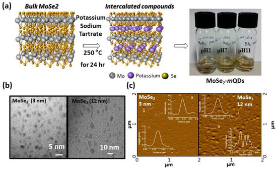 Figure 1. Synthesis and characterization of MoSe2-mQD [15]. (a). Schematic illustration of synthetic process of MoSe2-mQD and digital images of dispersed MoSe2-mQD in water with ph 2, 7, and 11. (b). TEM images of MoSe2-mQD-L (right) and MoSe2-mQD-S (left). (c). AFM images of MoSe2-mQD-S (left) and MoSe2-mQD-L (right) with height profiles.