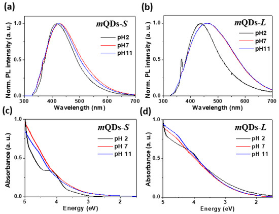 Figure 2a,b shows the PL spectra of MoSe2-mQDs-S and MoSe2-mQDs-L, respectively, measured with an excitation wavelength (λex) of 325 nm. For the MoSe2-mQDs-S (Figure 2a), the PL peak positioned at 418 nm with a full width at half maximum (FWHM) of 0.79 eV in pH 2, which is slightly red-shifted (Δλ~7 nm) and enlarged (ΔFWHM~0.07–8 eV) at pH 7 and 11. On the other hand, the PL peak of MoSe2-mQDs-L appears at 437 nm with a FWHM of 0.84 eV, which further red-shifts to 461 nm (Δλ~24 nm) and broadens to 1.07 and 1.08 eV of FWHM (ΔFWHM~0.23, 0.24 eV) in pH 7 and 11 (Figure 2b). By comparing the PL spectra of MoSe2-mQDs-S and MoSe2-mQDs-L, the pH variation was determined to have more effectively changed the PL spectrum than the size effect. Figure 2c,d shows the UV-vis absorbance spectra of MoSe2-mQDs-S and MoSe2-mQDs-L, respectively, according to the variation in pH. The absorbance spectrum of MoSe2-mQDs-S in pH 2 appears to have discrete absorption energy bands, however, this dimmed in pH 7 and 11. On the other hand, the MoSe2-mQDs-L shows a monotonically increasing absorbance at excitation energies lower than 4 eV, which is a feature of the metallic state QDs [14]. At excitation energies higher than 4 eV, the slope of absorbance similarly changed in both of MoSe2-mQDs. In addition, the absorbance of MoSe2-mQDs-L started to increase at a lower excitation energy than that of MoSe2-mQDs-S, regardless of pH. This analysis implies that the protonation besides the size effect enforces the quantum confinement in the MoSe2-mQDs, which is obviously observed in the MoSe2-mQDs-S with a size close to the Bohr exciton diameter [30]. The quantum yields (QY) of MoSe2-mQDs-S were 3.7%, 5.2%, and 5% at pH 2, 7, and 11, respectively, as measured using an absolute PLQY measurement system with an excitation wavelength of 325 nm. The PLQY could not be estimated in MoSe2-mQDs-L due to the low quantum efficiency. The values of peak position, FWHM, and QYs are listed on Table 1. These results imply that the oxidation of MoSe2-mQDs relieves the localization of the excited charges and the quantum confinement effect. On the other hand, the protonation of MoSe2-mQDs induces the energy band structure to be more discrete, which might be a cause of the low quantum efficiency, suggesting that the partial oxidation enhances the quantum efficiency of MoSe2-mQDs through forming sub-bands, which assists the intraband transition of charges.