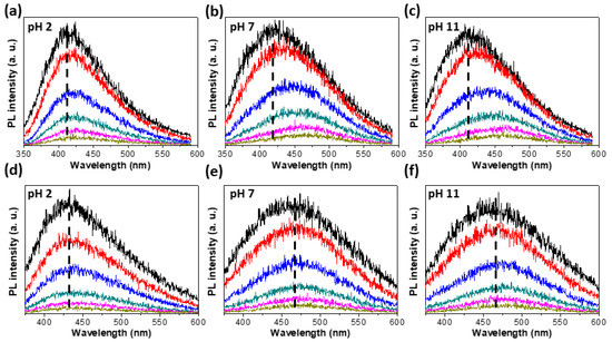 Figure 4 is the time resolved PL (TRPL) spectra depending on the pH of MoSe2-mQDs-S (Figure 4a–c) and MoSe2-mQDs-L (Figure 4d–f) measured at λex~266 and 310 nm, respectively, from 0 ns to 42 ns with six steps of time interval. The cumulative spectra of MoSe2-mQDs-S for the PL measurement time interval showed a similar trend in peak shift at the three pHs as time went on (Figure 4a–c). However, the peak shift was much clearer in pH 7 and 11, from ~415 nm to ~465 nm, indicating that the charge delocalization and migration to the lower energy states easily occur when the MoSe2-mQDs are oxidized. This is in line with the analysis in Figure 3 that the decay pathway of excitons has an intrinsic bandgap in the protonated MoSe2-mQDs-S, while the band edge changes as the pH increases. In comparison, the MoSe2-mQDs-L does not show a distinct peak shift in all pHs, although the PL peak position in pH 2 is ~430 nm and shifts to ~465 nm in pH 7 and 11. Because the PL peaks of MoSe2-mQDs-L in pH 2 are closer to the values (~415 nm) of MoSe2-mQDs-S than the values (~465 nm) in pH 7 and 11, the size effect looks to be weaker than the pH effect. This again confirms that the protonation of MoSe2-mQDs enhances the exciton decay at the band states with an intrinsic bandgap.