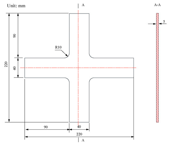 The following are the five primary dimensions of the classic cruciform specimen: the length is 220 mm; the width is 220 mm; the thickness is 5 mm; the cross-arms width is 40 mm, and the fillet at the corner is 10 mm (