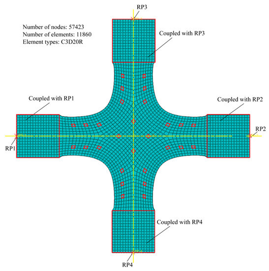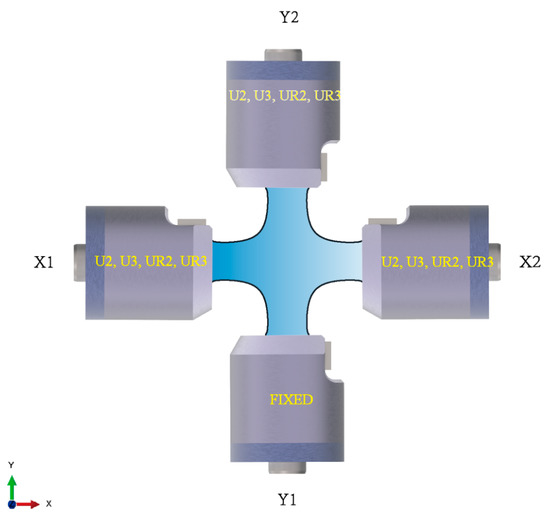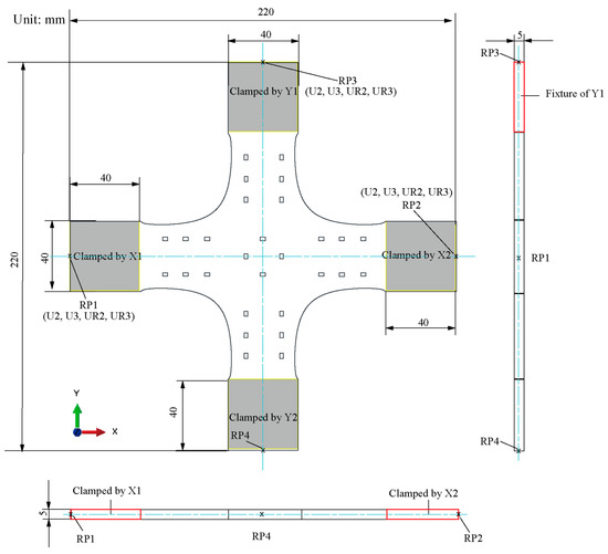 Figure 9). In the simulation process, the following three settings have been made: freeze the six degrees of freedom of the Y2 end; free X1U2, X2U2, and Y1U2; couple the four clamping ends with the reference points: RP1, RP2, RP3, and RP4, respectively. In addition, to simulate different alignment deviations, we change the displacement boundary conditions with four reference points.