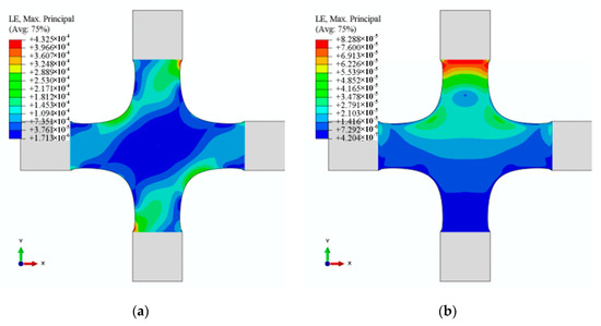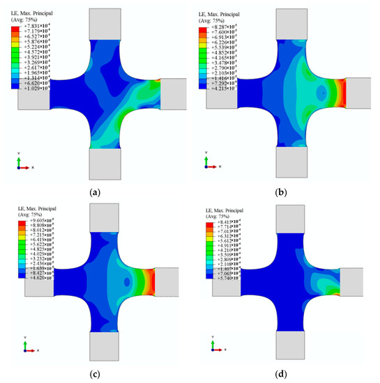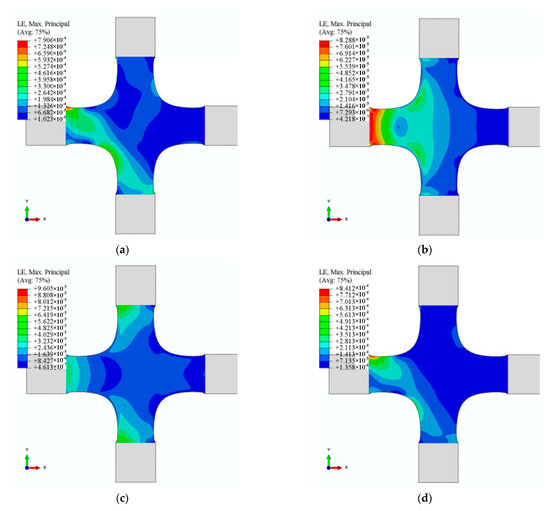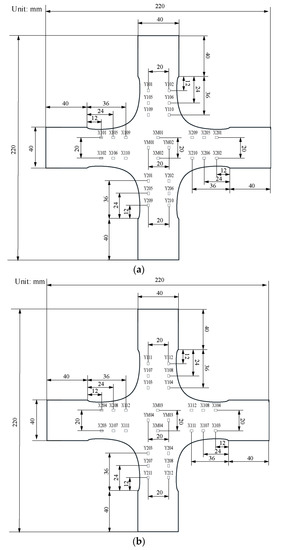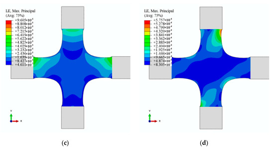 The generality of the hydraulic and profiling fixtures and 12 alignment deviations is maintained without losing generality. The fixtures of hydraulic and profiling fixtures markedly differ in clamping form. The six alignment deviations (U2 and UR3 in X1; U2 and UR3 in X2; U2 and UR3 in Y1) cannot exist for the hydraulic fixtures. The 12 alignment deviations involved in X1, X2, and Y1 are inevitable for the profiling fixtures because of the limitation of locators/clamps, such as grooves. The strain distribution on the specimen depends on the constraints of the fixture. The constraints of the six alignment deviations cannot exist for the hydraulic fixtures, indicating that the contribution to the strain distribution must be close to zero. Hence, the working condition—the cruciform specimen clamped by hydraulic fixtures—is only a particular case in this study.