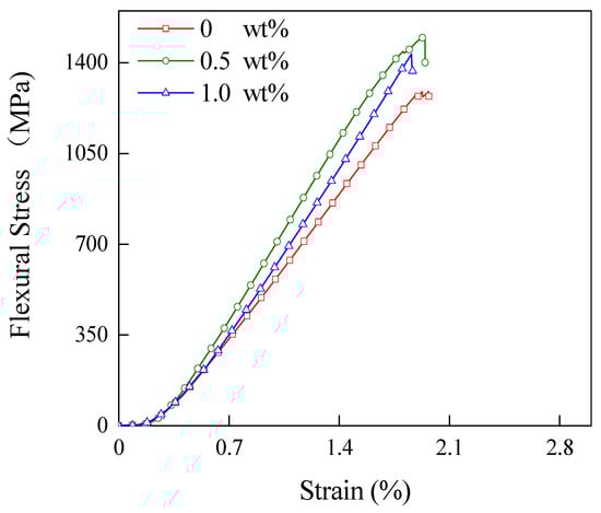 The flexural stress–strain curves of laminates with different CNT contents at 65 wt% CF content are shown in Figure 4. As shown in this figure, the flexural strength and flexural modulus of the laminates increase and then decrease with the increase in CNT content. The flexural strength reaches a maximum of 1494 MPa when the CNT content is 0.5 wt%. Compared with the laminate without CNT addition, the flexural strength increased by 15.99%. This indicates that the addition of CNT improves the interface between the laminate layers and increases the bond strength between the layers. When the CNT content reached 1.0 wt%, the flexural strength and modulus of the laminate show a decreasing trend. This is because the excess CNT agglomerates inside the material and distributes unevenly inside the laminate, and the layers are more likely to debond and fail at the CNT agglomeration.