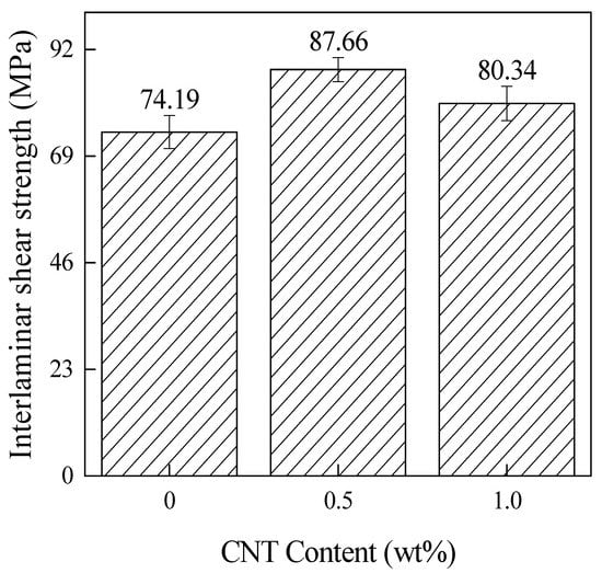 Figure 7 shows the relationship between different CNT contents and ILSS of the CNT/CCF/PEKK laminates. In the figure, the ILSS of the laminates with 0.5 wt% and 1.0 wt% CNT increased by 18.16% and 8.29%, respectively, compared to the laminates without CNT addition, which is due to the penetration of CNT into the internal layers of the laminates, resulting in an increase in the degree of interlayer compactness and an increase in the resistance to interlayer movement. In addition, the ILSS of the 1.0 wt% CNT-content laminate was 8.34% lower than that of the 0.5 wt% CNT laminate. This may be due to the fact that a large amount of CNT agglomerates in the laminate and breaks the degree of interlaminar bonding at the agglomerates, causing the laminate to peel off the interlaminar by stress concentration when subjected to shear force. In the study of Yousefi et al. [], it was found that excessive CNT also led to the decrease in ILSS. They attributed this phenomenon to the high voids in the composites.