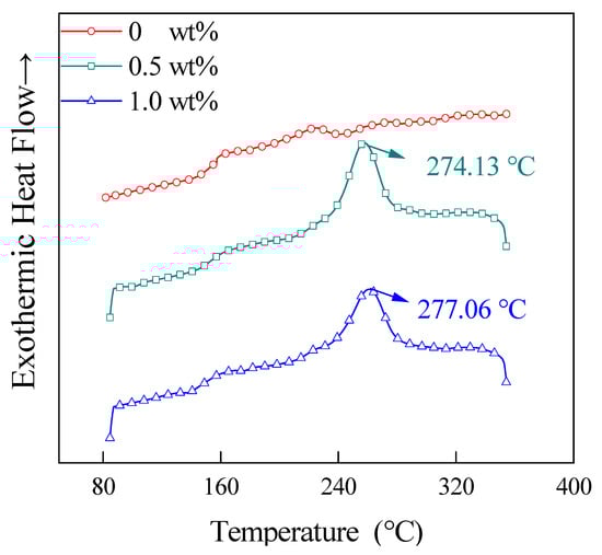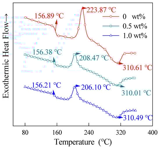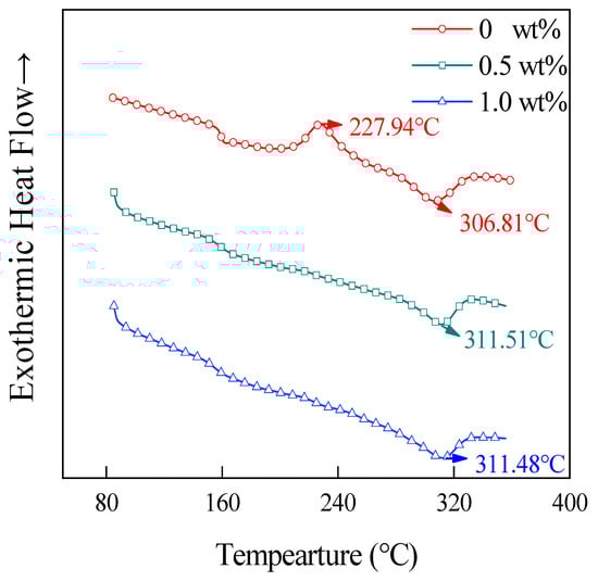 Figure 9 shows the cooling curves of the CNT/CCF/PEKK composites with different CNT contents, and in this figure, no obvious crystallization peaks appear in the cooling curves of the composite without the addition of CNT, while the crystallization peaks of the composites are obvious after the addition of CNT, and the temperature of the crystallization peaks moves toward the high temperatures with the increase of the CNT content. This may be due to the fact that the CF surface used in this paper has a high surface energy, which limits the growth of PEKK transverse crystals [] so that PEKK crystals can only grow along the fiber direction, and at high fiber content, the spacing between CFs is small, which limits the growth of the PEKK spherical crystals. After adding CNT, CNT forms a network inside the material, and PEKK can crystallize along the CNT network, making the material easier to crystallize, with obvious crystallization peaks and moving toward higher temperatures with increasing CNT content.