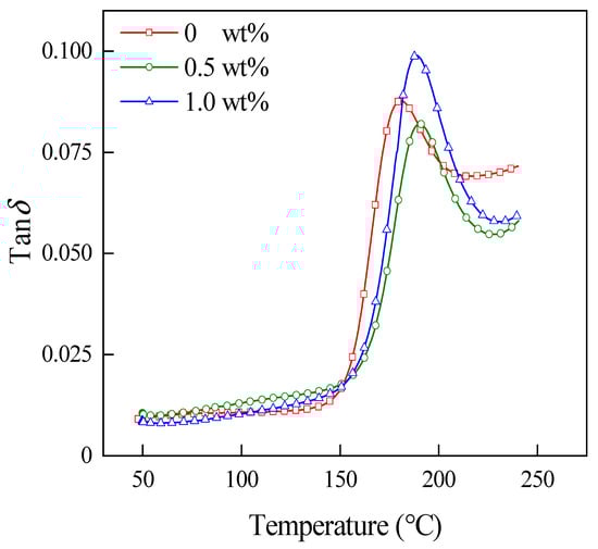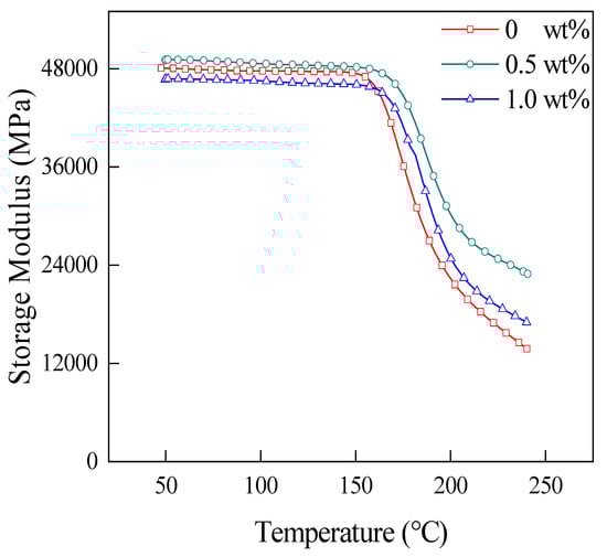 The storage modulus (E′) reflects the ability of a material to resist deformation. Figure 11 shows the E′-temperature curves of laminates with different CNT contents at 65 wt% of CF. In this figure, the initial E′ of the laminate is highest when 0.5 wt% (relative to the mass of PEKK, same below) CNT is added to the laminate. This is because the addition of a moderate amount of CNT can improve the deformation resistance of the material and increase the bonding force between CF and PEKK. The initial E′ of the laminate is lower when 1.0 wt% CNT is added, which is because the excessive amount of CNT leads to an obvious agglomeration phenomenon, and the agglomeration breaks the interface between CF and PEKK. In addition, the E′ drop is greater for the laminate without CNT addition, suggesting that the addition of CNT can increase the potential of the material for long-term use.