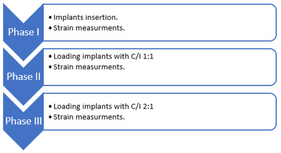 Strain was measured during the insertion phase for BLI and for STI. Then, each test specimen was mounted in an insertion loading machine (a special custom machine for Tel-Aviv University by J. MANAS LTD., Tel-Aviv, Israel) (Figure 4). Abutments of 8 mm and 16 mm were prepared to mimic 1:1 and 2:1 C/I ratios. The abutments were connected to the implants. Each sample was loaded with 100 N for 100 cycles [31,32].